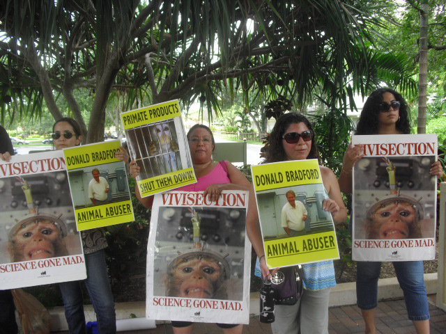 For two hours we held signs and spoke to golf club members about Bradford and his unethical company. We also passed out leaflets which briefly describe what heartless Bradford does for money. The people’s outrage was strong. One member of the golf club, unable to hold back his rage, told us that Bradford “should be shot.” While understanding his anger, we want Bradford to develop a conscience and shut down Primate Products. And we promise to do all we can to bring about this end. For the animals, for life, and for freedom! We will FIGHT!