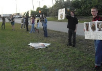 As with the day before, in front of Pam Rollins’ home, there were two creepy men silently standing at a distance with a noise amplifier and a camera high on a tripod following our movements. The cold compliance of these men and the other paid guards of Amerijet will have no effect on the efforts of dedicated and caring activists.