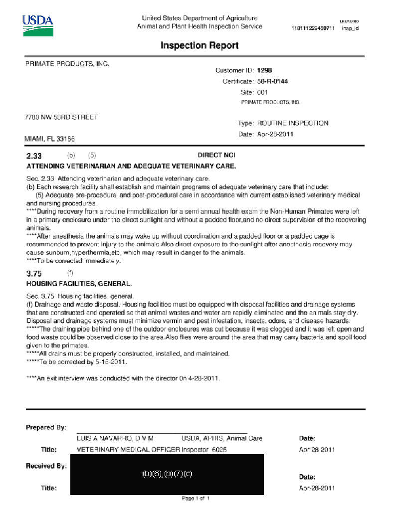 On April 28, an inspector with the U.S. Department of Agriculture visited Primate Products’ facility in Immokalee, Florida and found monkeys recovering from a health exam. The monkeys, still under anesthesia, had been left in an enclosure, without supervision, in the hot sun.