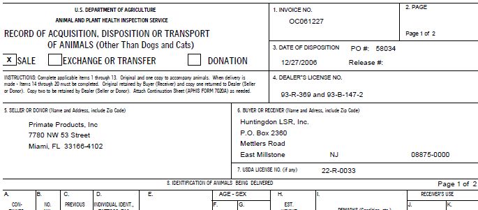 The documents include contracts, invoices, U.S. Fish and Wildlife Service import permits, animal health certificates issued by the People’s Republic of China, shipping routes, contact sheets, and miscellaneous e-mails (such as correspondence about a December 2007 trip to Florida by three HLS employees from the UK and US to tour Primate Products, Inc.’s quarantine facility and breeding farm).