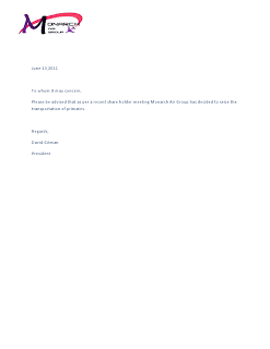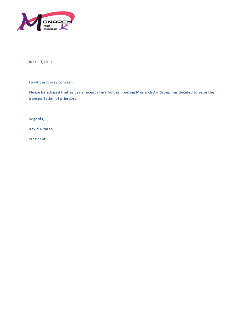 At 1:51pm, Monarch Air Group issued a statement that they have decided to cease transporting primates. It reads: “Please be advised that as per a recent share holder meeting Monarch Air Group has decided to seize [sic] the transportation of primates.”